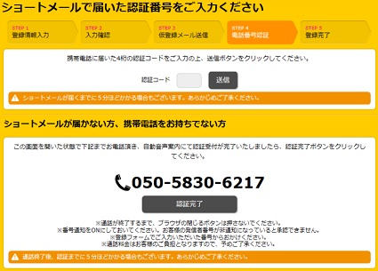 ※固定電話などショートメールが届かない電話番号で登録申請をした人は、上の画像のページが開いた状態で「050-5830-6217」に電話をかけます。自動音声で認証受付が完了したら「認証完了ボタン」をクリックします。